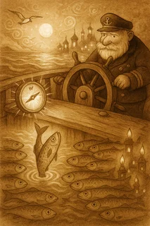 Man beschloss, den Kompass zu ignorieren. Ein Fehler, wie sich zeigen sollte. Denn kurz darauf tauchte ein Schwarm Heringe auf. Nicht unter dem Schiff, sondern vor dem Schiff in ordentlichen Reihen, als hätten sie geübt.Der vorderste Hering blieb stehen, sah zur Brücke hoch und klopfte dreimal mit der Schwanzflosse gegen das Wasser.Der Kompass drehte sich schlagartig nach Norden.„Siehst du“, murmelte Hinnerk. „Der kennt die.“ Man segelte weiter, nun streng nach Kompass. Die Heringe begleiteten das Schiff, links und rechts, wie eine Eskorte. Immer wenn jemand fluchte, tauchte einer auf und sah vorwurfsvoll.Am Abend lief man in einen Hafen ein, den keiner kannte, aber jeder sofort mochte. Die Laternen brannten, obwohl niemand sie angezündet hatte, und im Hafenbecken roch es nach frisch gebratenem Fisch.Der Wirt sagte nur:„Gut, dass ihr auf den Kompass gehört habt. Der zeigt nicht die Richtung, sondern den Willen des Meeres.“