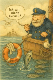 Kapitän Hinnerk hatte einen Rettungsring, den er „Erna“ nannte. Niemand fragte nach dem Namen – auf See stellt man keine Fragen, wenn die Dinge funktionieren. Und Erna funktionierte. Sie hing am Mast, war rund, orange, und schwieg.Bis zu jenem Morgen.Da fiel sie über Bord. Kein Sturm, kein Seegang, nicht mal ein Windstoß. Einfach plopp – weg. Hinnerk sprang hinterher. Nicht aus Panik, sondern weil ersagte: „Erna kann schwimmen. Aber sie mag Gesellschaft.“Im Wasser drehte sich der Ring einmal um sich selbst und sagte – ganz deutlich: „Ich will nicht zurück aufs Schiff. Da riecht’s nach nassen Socken.“Der Bootsmann schwor, er habe es auch gehört. Der Steuermann meinte, das sei nur das Echo vom Möwenschrei. Die Möwe sagte: „Quatsch, ich schrei gar nicht. Ich pfeife höchstens.“Man holte Erna mit dem Seil zurück. Sie ließ sich ziehen, drehte sich zur Reling und schwieg wieder. Seitdem hängt sie am Mast. Jeden Morgen bekommt sie ein frisches Handtuch. Nicht, weil sie nass wäre. Sondern weil Hinnerk sagt: „Wenn ein Rettungsring einmal spricht, sollte man ihn nicht mehr ignorieren.“Und manchmal, wenn keiner hinsieht, streicht er ihr über die Kante und murmelt: „Du hast recht. Die Socken sind wirklich ein Problem.“