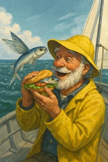 Es war ein ruhiger Sommertörn irgendwo zwischen Helgoland und Sylt. Die Crew döste an Deck, als plötzlich ein silberner Blitz aus dem Wasser schoss – ein fliegender Fisch! Er segelte elegant über die Reling und landete direkt im Schoß des Skippers, der gerade sein belegtes Brötchen auspackte.